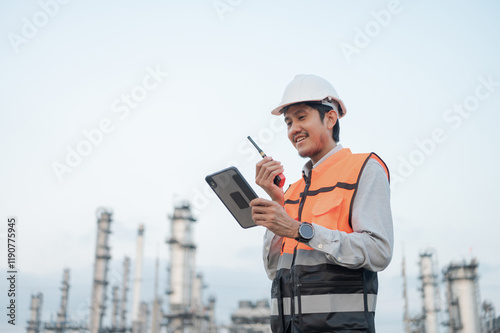Smiling Asian male engineer wearing safety uniform standing in front of oil refinery with tablet device Radio communication to monitor oil refinery operations Petrochemical Gas Industry Engineer