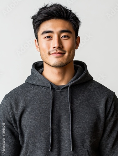 Smiling Asian Man in Casual Hoodie Perfect for Lifestyle Blog and Advertising