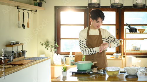 Smiling Asian man monitoring cooking time while preparing a meal.
