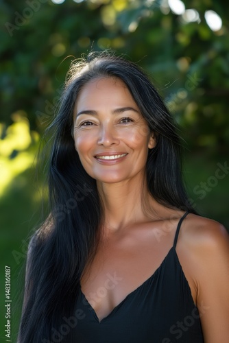 smiling, asian, mature, female, outdoors, long, hair, black, top, woman, nature, park, summer, sunlight, portrait, happiness, content, serene, peaceful, radiant, confident, graceful, elegant, beauty, natural, expression, relaxed, greenery, grass, background, joyful, cheerful, face, skin, healthy, vibrant, calm, positive, lifestyle, calmness, harmony, middle-aged, attractive, bright, casual attire