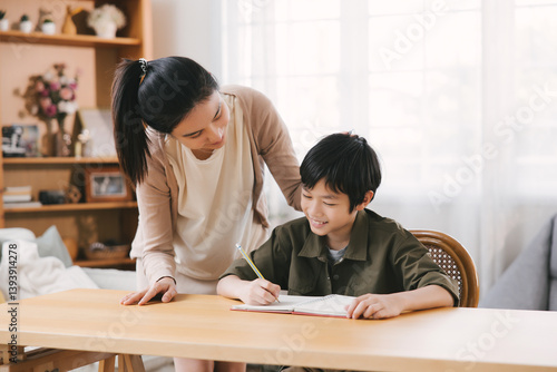 Smiling Asian mother and son bonding while studying at home desk. The room's cozy atmosphere warmth, love, and family inspiration. Ideal for portraying familial relationships and educational moments.