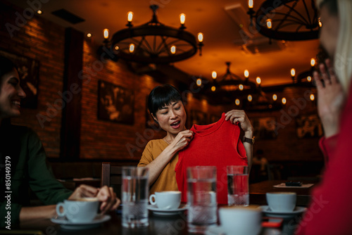 Smiling Asian woman showing her friends what clothes she bought in shopping, they are in the restaurant