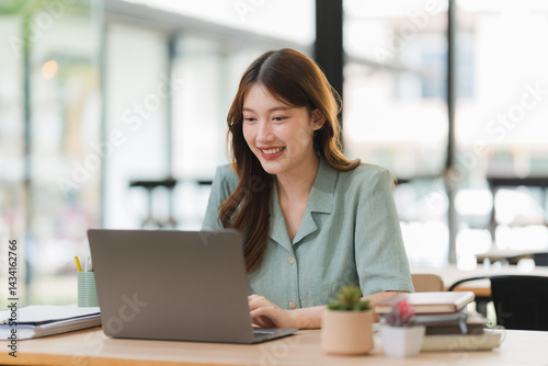asian woman, laptop, working, smiling, businesswoman, office, desk, happy, computer, female, young, business, technology, workplace, confident, cheerful, entrepreneur, student, learning, studying, online, communication, connection, cyberspace, digital, modern, indoor, table, potted plants, notebook, document, light, bright, casual attire, shirt, positive, success, achievement, professional, job, career, education, cognition, sharpened, concentration, lifestyle, person, one person