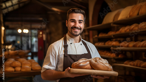 baker, bakery, bread, man, tray, food, baking, business, store, shop, smiling, person, fresh, smile, man, chef, businessman, banner, copy space, advertisement, poster, job, work, ai