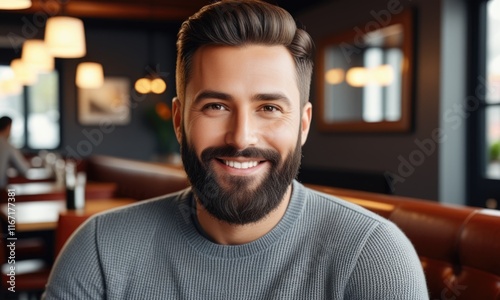 Smiling bearded man in cozy café setting with modern lighting and warm ambiance