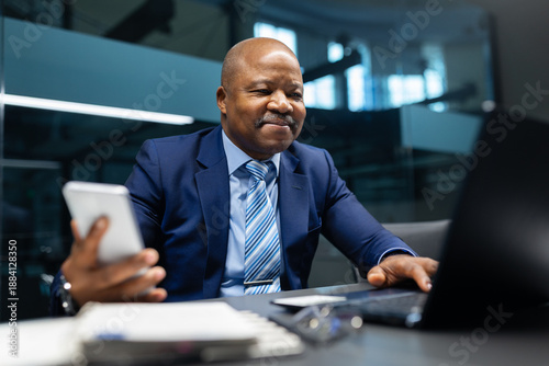 Smiling black mature businessman holding smartphone while working at desk in modern office, combining technology, leadership, and professional corporate lifestyle