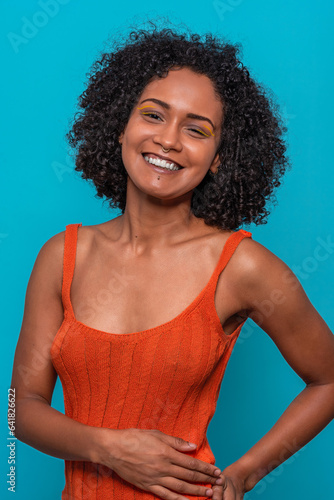 woman, fashion, model, slim, orange, top, dark hair, curly hair, female, black, african american, outfit, clothes, wear, casual attire, brunette, afro, coiffure, coiffure, make-up, appearance, calm, peaceful, confident, carefree, charismatic, beauty, charme, gorgeous, coquette, personality, colourful, high-coloured, vibrant, gaze, stare, blue background, happy, content, smile, racked, piercing, toothy smile, cheerful, look, portrait, ethnic