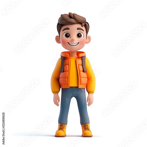 Smiling Boy in Orange Vest: A friendly 3D rendered cartoon boy with brown hair and wearing a bright orange vest, smiles warmly at the viewer. The character is rendered in a playful and inviting style.