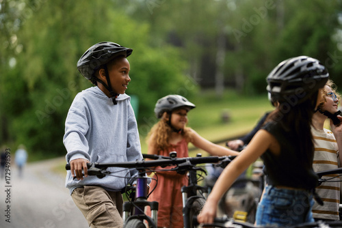 Smiling boy wearing helmet while standing with cycle around friends at summer camp