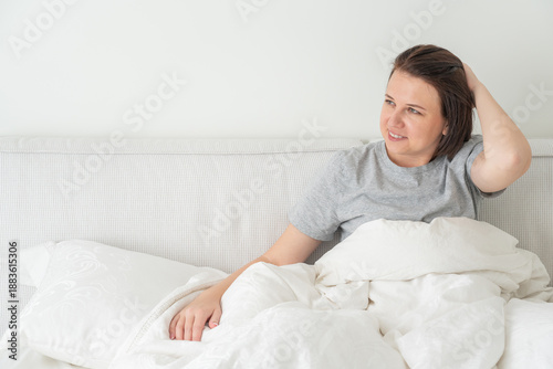 bed, woman, beautiful, bedchamber, happy, sitting, morning, young, female, pretty, home, attractive, comfortable, room, indoor, smiling, white, lifestyle, girl, awake, bedding, calm, relax, caucasian, adult, rest, arousing, cheerful, pillow, relaxing, smile, portrait, person, resting, lazy, duvet, pillow, comfort, relaxation, leisure, pajama, lady, up, laziness, waking, background, brown hair, brunette