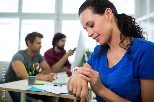 business, wrist, office, executive, lifestyle, checking, casual attire, time, professional, dependability, occupation, profession, beautiful, colleague, workplace, corporate, expertise, clothing, co-worker, smiling, company, content, career, watch, happy, wear, team, job, in