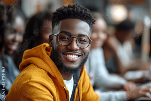 Smiling businessman and colleagues sitting together in a boardroom, symbolizing teamwork and leadership.