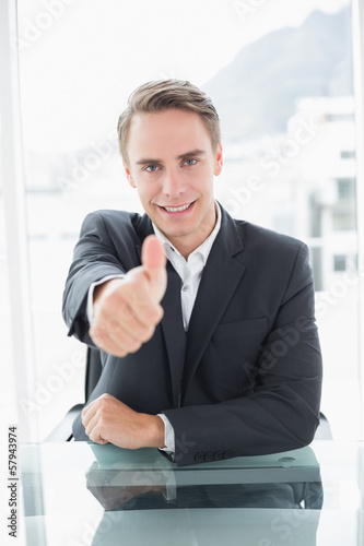 Smiling businessman gesturing thumbs up at office desk