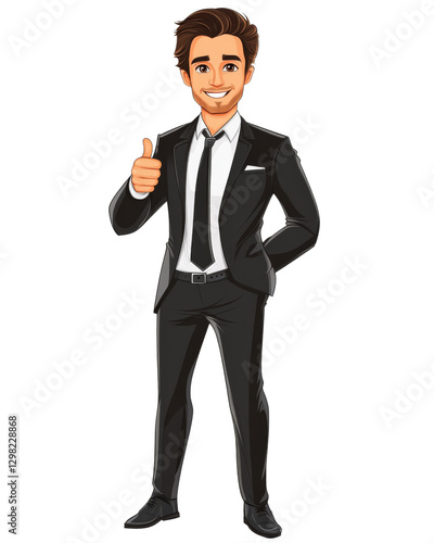 businessman, thumb, up, suit, attaching, smiling, happy, positive, agreements, approval, success, business, professional, office, corporate, men at work, male, man, gesture, body, language, communication, confidence, ok, like, good, excellent, transparency, alpha, grooved, cut-out, isolated, illustration, cartoon, vector, graphic, design, character, full, standing, posing, transparent, background, white