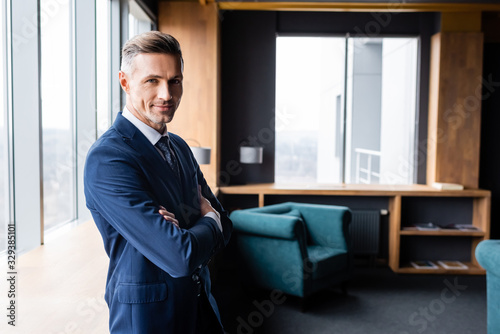 smiling businessman in suit with crossed arms looking at camera in hotel