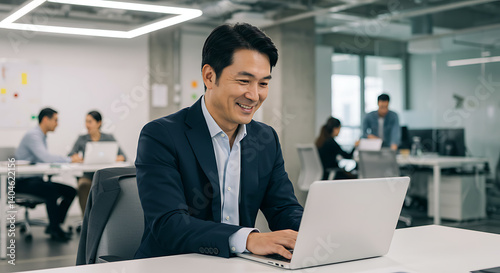 Smiling Businessman, Modern Office, Laptop Success AI Generated