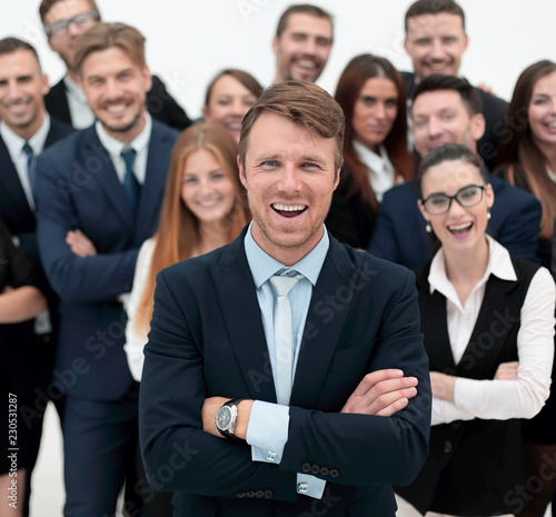 smiling businessman standing on background of her business team.