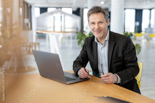 Smiling businessman with laptop sitting at office