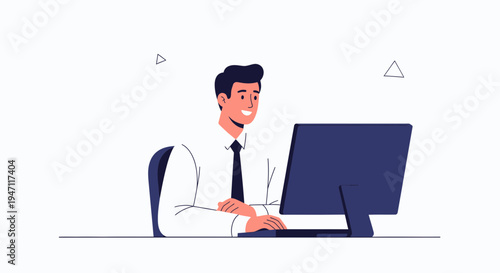 Smiling businessman working on a computer at his desk, modern office illustration