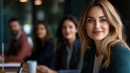 Smiling businesswoman in a meeting with her team, exuding confidence and leadership in a modern office setting.
