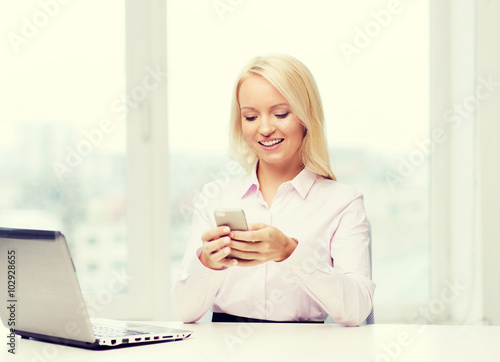 office, businesswoman, business, smartphone, woman, happy, texting, message, phone, laptop, secretary, chatting, gossiping, communication, teacher, technology, computer, education, attractive, people, person, sexy, female, concept, smiling, young, girl, beautiful, university, professional, corporate, manager, sitting, table, carefree, careless, break, cheerful, contraption, app, application, mobile phone, mobile, connection, social, networking, cyberspace, online, browsing