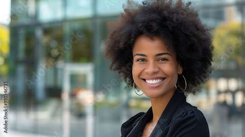 Smiling Businesswoman with Afro near Glass Office Building, Urban Workplace
