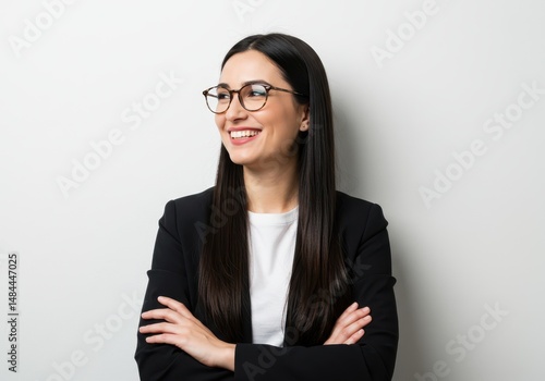 woman, businesswoman, portrait, brunette, hair, long hair, goggles, eyeglass, smile, smiling, arms crossed, confidence, confident, professional, executive, manager, employee, office, corporate, caucasian, adult, one person, indoor, white background, blazer, shirt, clothing, fashion, style, looking away