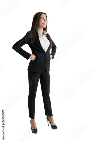 Smiling businesswoman with hand on hip, black suit, isolated on white. Confident professional pose