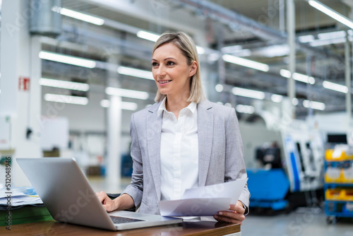 smiling, businesswoman, laptop, document, factory, copy space, technology, 1, people, industry, computer, adult, business, woman, job, confidence, shop, floor, caucasian, female, blazer, standing, contented, accessibility, holding, using, thinking, mid, grey, occupation, manager, looking, working, contemplation, connection, wireless, cyberspace, blond