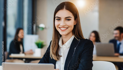 Smiling businesswoman working on a laptop at a modern office during the day with colleagues in the background