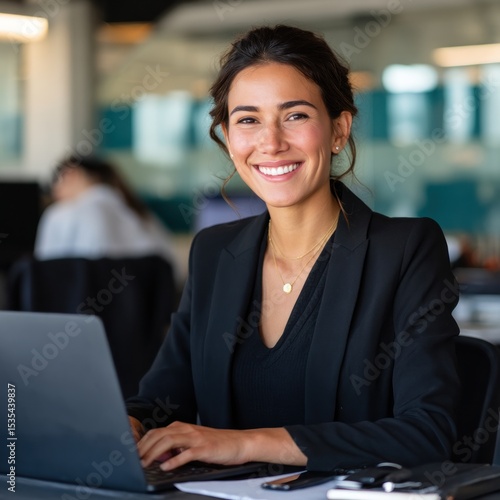 businesswoman, woman, smiling, happy, professional, office, laptop, working, professional woman, employee, business, technology, career, successful, confident, computer, female, indoor, day, adult, productivity, sharpened, office worker, business attire, 1, cheerful, attentive