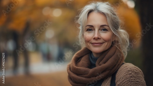 Smiling cheerful beautiful blonde caucasian mature woman looking at the camera while walking in city public forest wood park : Generative AI