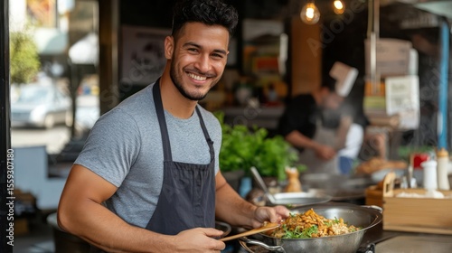 cooking, cook, person, smiling, food, wok, eatery, happy, portrait, male, working, cheerful, asian, dish, preparing, looking, front, eating, adult, healthy, meal, delicious, fresh, kitchen, professional, lifestyle, work, service, business, young, enjoying, market, vegetable, activity, closeup, casual attire, apron, trade, expert, daylight