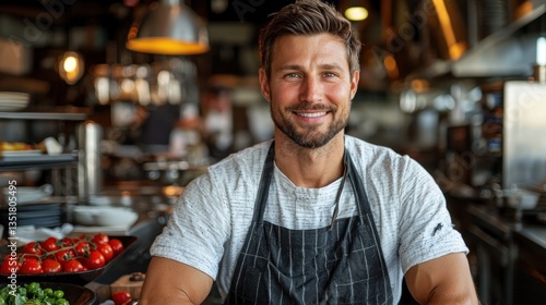chef, eatery, kitchen, smile, happy, man, apron, food, professional, cooking, waiter, barkeeper, hospitality, staff, industry, portrait, business, service, commercial, background, serving, healthy, meal, delicious, dish, tasty, appetising, fresh, produce, tomatoes, vegetable, quality, ingredient, cookery, modern, friendly, confident, client