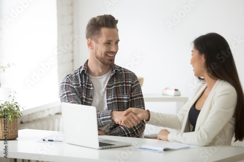 Smiling colleagues shaking hands thanking for successful work, help, happy employee handshaking mentor, businesswoman greeting business partner ready for cooperation. Collaboration, teamwork concept