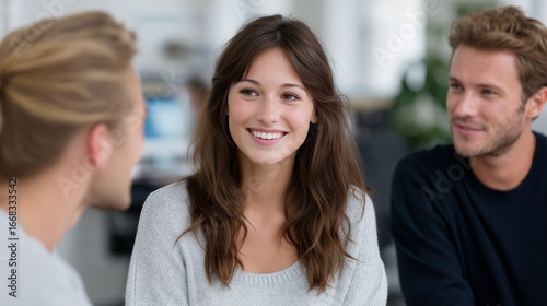 Smiling colleagues sharing ideas in a casual office meeting, team brainstorming, casual workplace, office discussion, collaborative ideas, friendly atmosphere