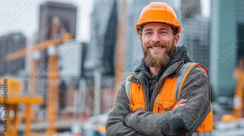construction, men at work, smile, smiling, safety, helmet, orange, vest, engineer, builder, city landscape, professional, confidence, urban, crane, development, industrial, architecture, site, structure, engineering, occupation, job, labourer, equipment, beard, building, project, supervisor, contractor, municipality, industry, infrastructure, design, teamwork, workplace, progress, logistic, manager, hard-working, skilled, dedication