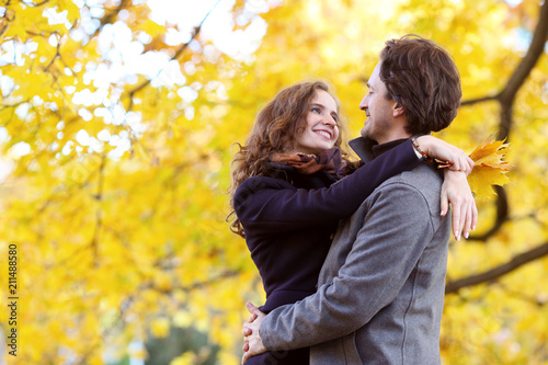 Smiling couple hugging in autumn park