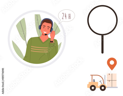 Smiling customer support agent in headset, speech bubble with 24H, magnifying glass, forklift moving boxes, location pin. Ideal for customer service, logistics, delivery, search business