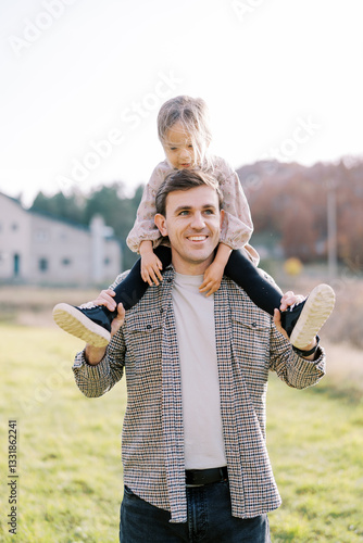 Smiling dad carries little girl on his shoulders across the meadow, looking to the side