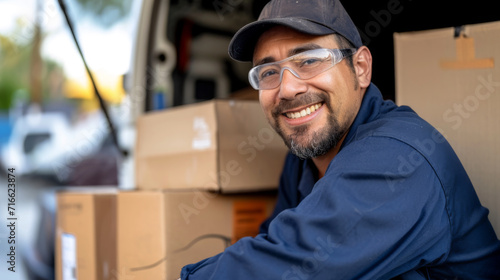 smiling delivery man in a blue uniform and safety goggles is handling boxes near a delivery van