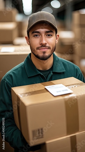 man, delivery, box, warehouse, smile, cap, uniform, package, shipping, men at work, postal, distribution, logistic, cargo, industry, transportation, mail, business, service, job, employment, carrier, trade, commerce, supply, chain, production, retail, storage, shelf, indoor, professional, occupation, young, adult, male, happiness, portrait, friendly, looking, forward, work, employee, order, receive, stack, paperboard, cardboard, material