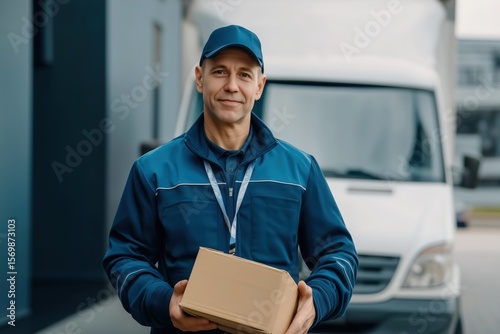 smiling delivery person in a blue uniform holds a box. A white van is visible in the background