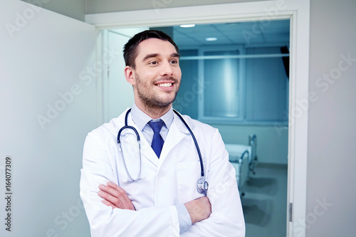 smiling, doctor, medic, man, medicine, hospital, clinic, health care, stethoscope, health, ward, happy, cheerful, nice, white, coat, uniform, emergency, medicals, people, professional, specialist, practitioner, profession, person, concept, job, latin, hispanic, occupation, indoor, doc, corridor, room, crossed, arm, serious, confident, male