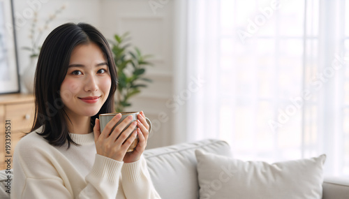 woman, mug, hot drink, tea, drinking, home, relaxation, cosy, comfort, living room, sofa, couch, asian, female, adult, person, smiling, holding, ceramic, cup, beverage, hot, drink, morning, afternoon, lifestyle, indoor, window, light, soft, curtain, plant, interior, domestic, sweater, white, knit up, leisure, rest, break, wellness, happiness, portrait, copy space, photo, apartment, house