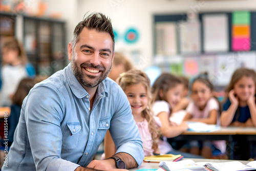 smiling elementary school male teacher with students learning in the background, perfect for use in educational services marketing, school program promotions, and teacher training campaigns