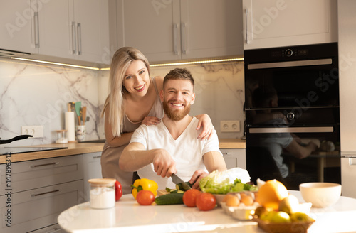 man, guy, caucasian, young, interior, home, european, modern, flat, apartment, smiling, woman, beautiful, smile, table, photogenic, kitchen, bearded, food, vegetable, fresh, organic, salt, egg, healthy eating, diet, dieting, girl, whole, chopping board, knife, salad, basket, slice, fruit, bowl, sliced, cut, healthy, cutting, couple, attractive, boyfriend, pretty, blond, cucumber, girlfriend, human relationships