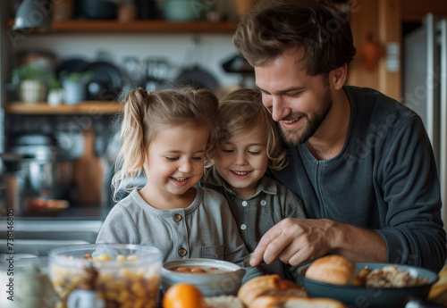 Smiling family having fun while cooking breakfast together, creating precious moments in a warm kitchen