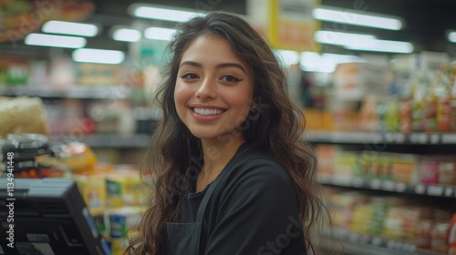 cashier, grocery, store, woman, smiling, retail, client, checkout, young, food, shopping, service, professional, happiness, job, confidence, people, business, lifestyle, work, expressiveness, friendly, presentation, bright, interior, colours, product, inventory
