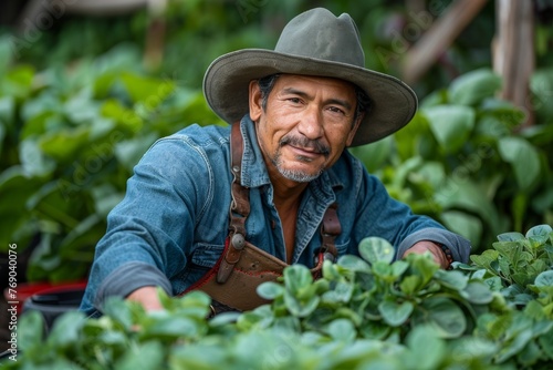 Smiling gardener wearing a cowboy hat, proudly working with lush green plants in a greenhouse